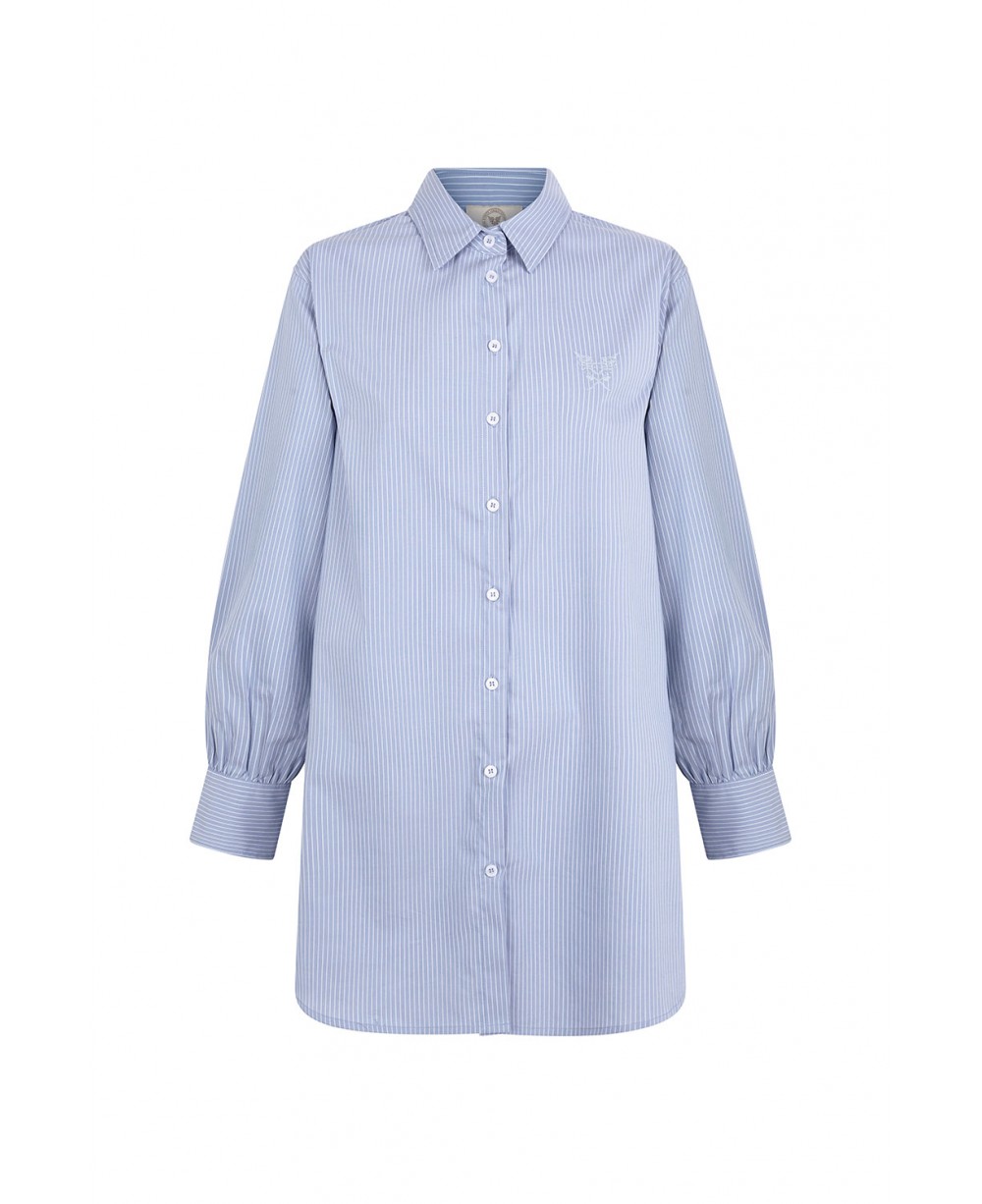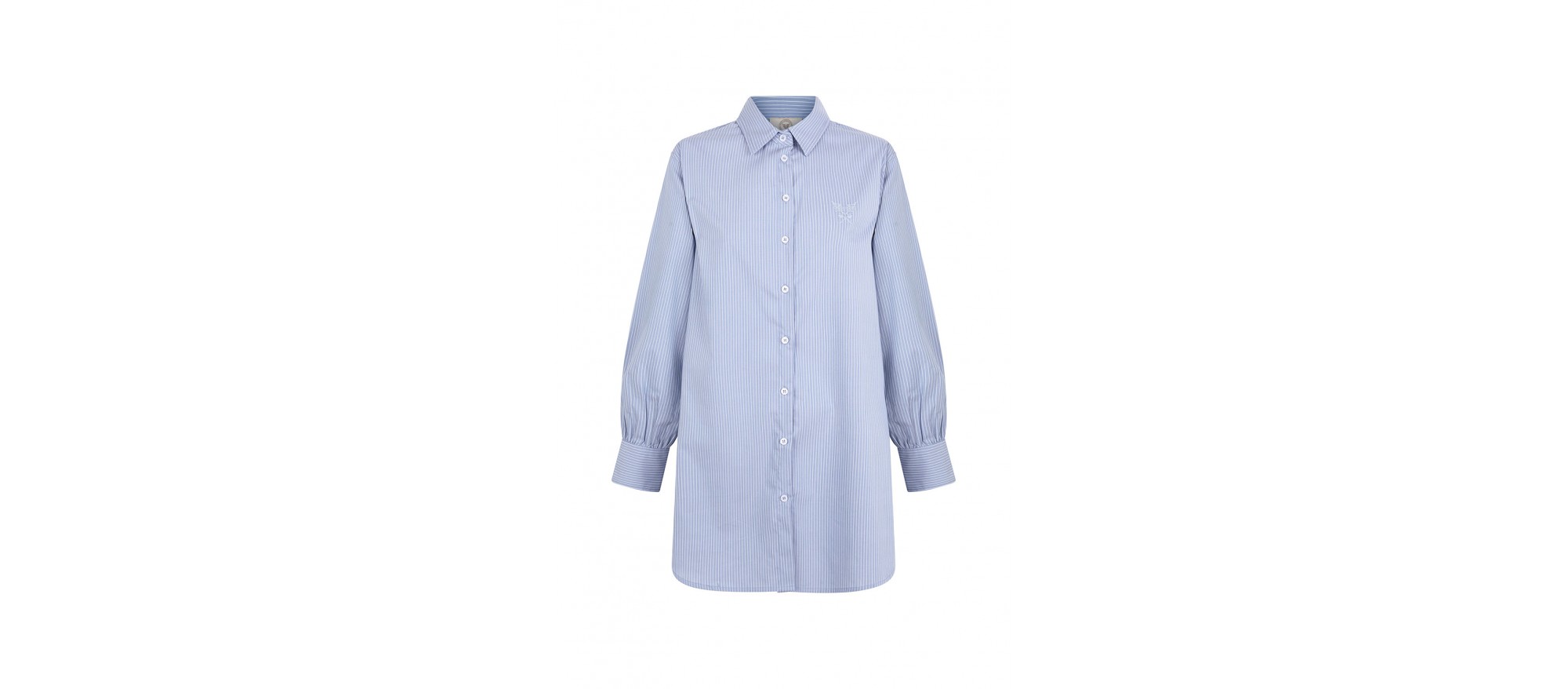En una versión azul de inspiración marina, esta camisa larga propone una forma relajada de vestir con estilo y frescura. El tejido con mezcla de algodón y poliéster aporta confort y durabilidad, mientras que las rayas azules refuerzan el aire costero y natural de la colección. Perfecta para sobreponer en capas o llevar como prenda principal.