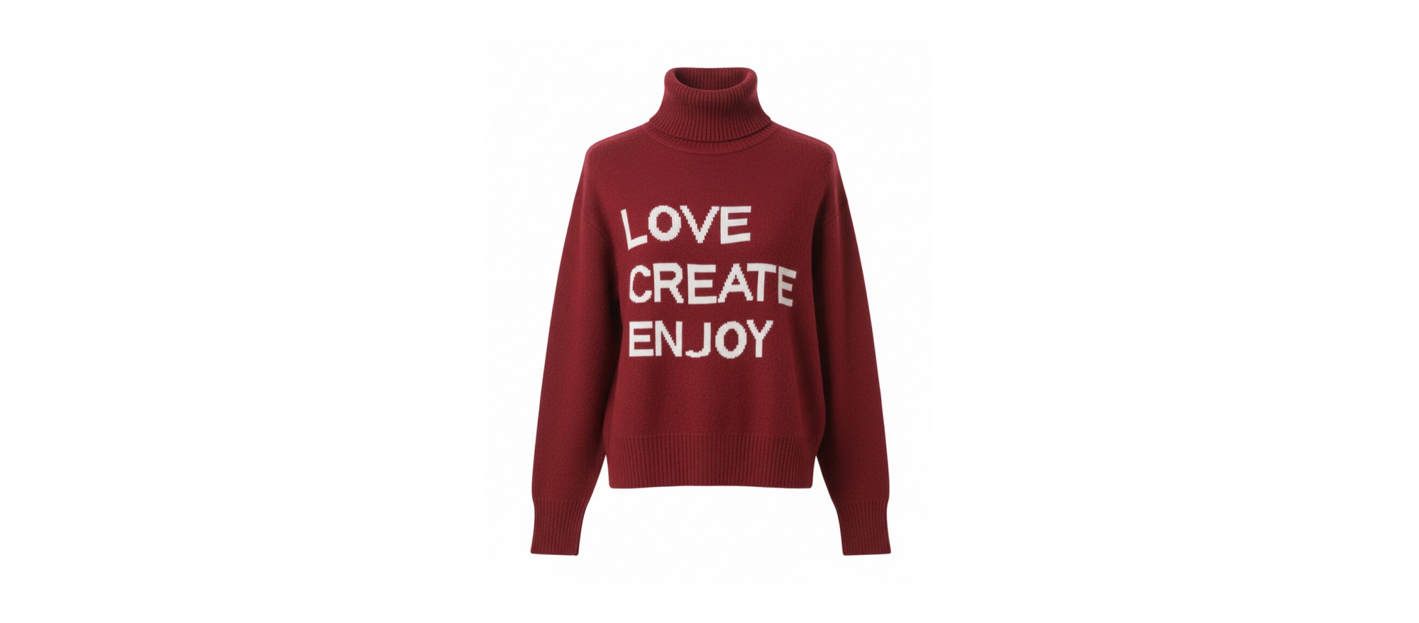 Un mensaje de texto en jacquard que se convierte en filosofía de vida: “Love, Create, Enjoy”. El jersey de punto en tono granate aporta fuerza, sofisticación y modernidad, mientras que la mezcla de fibras premium asegura suavidad y confort.