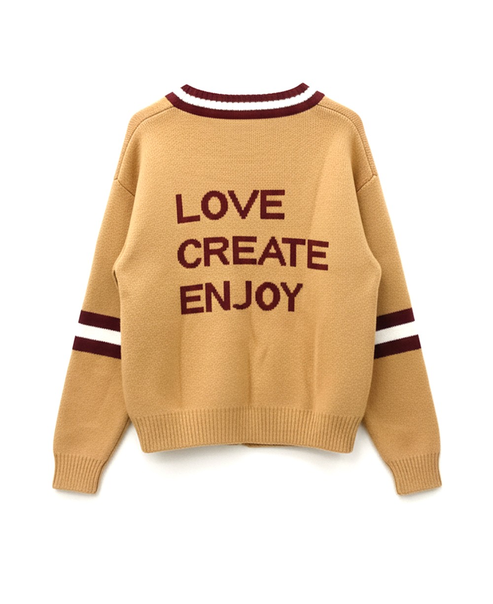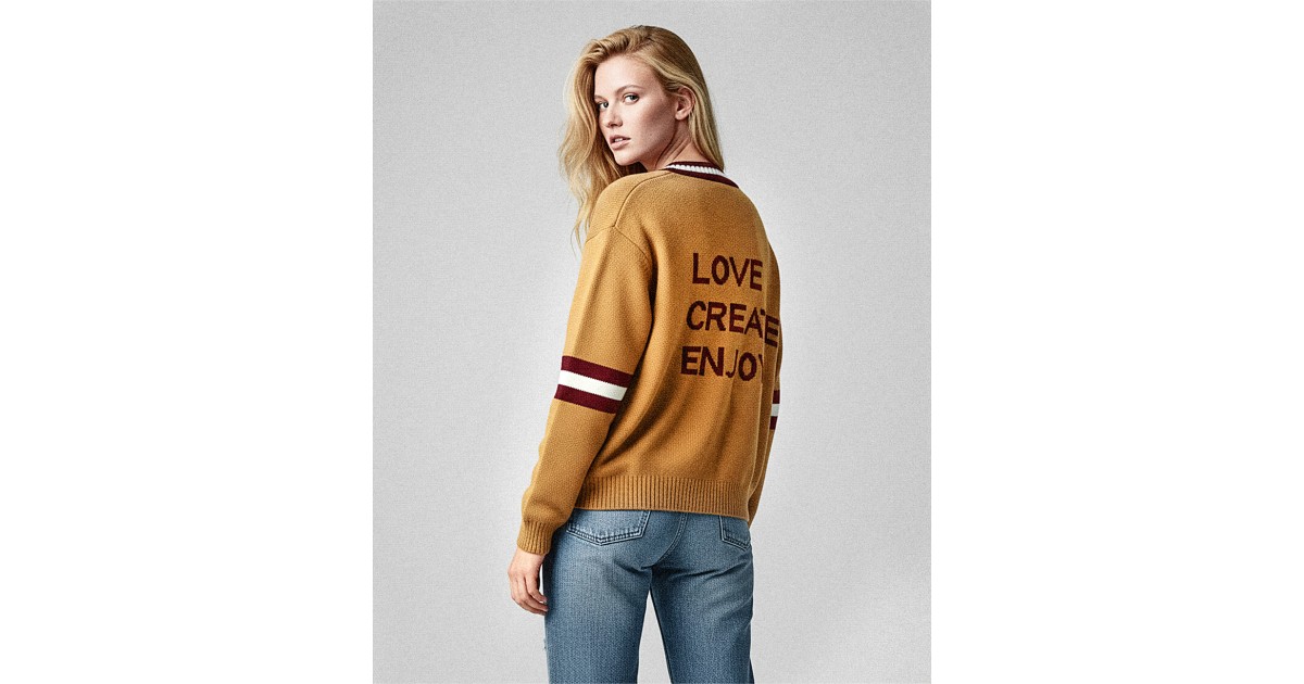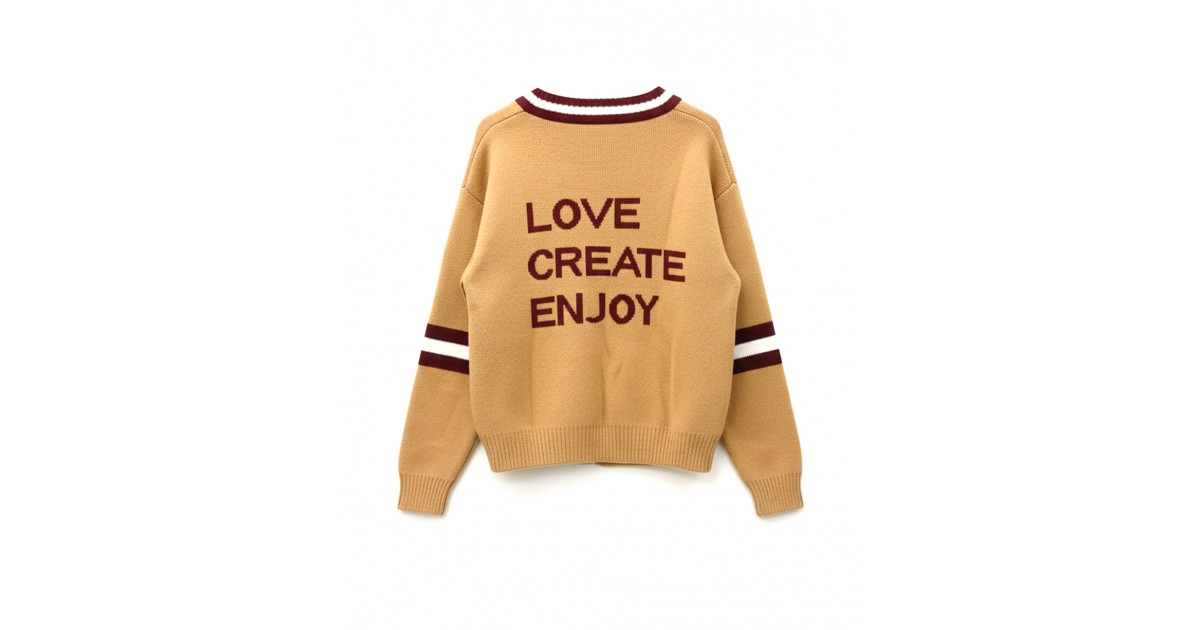 Un cardigan en tono cámel con detalles en contraste y el lema “Love, Create, Enjoy”. Una prenda versátil que combina la comodidad del punto con la fuerza de un mensaje vital. Ideal para elevar looks diarios con un aire auténtico y creativo.