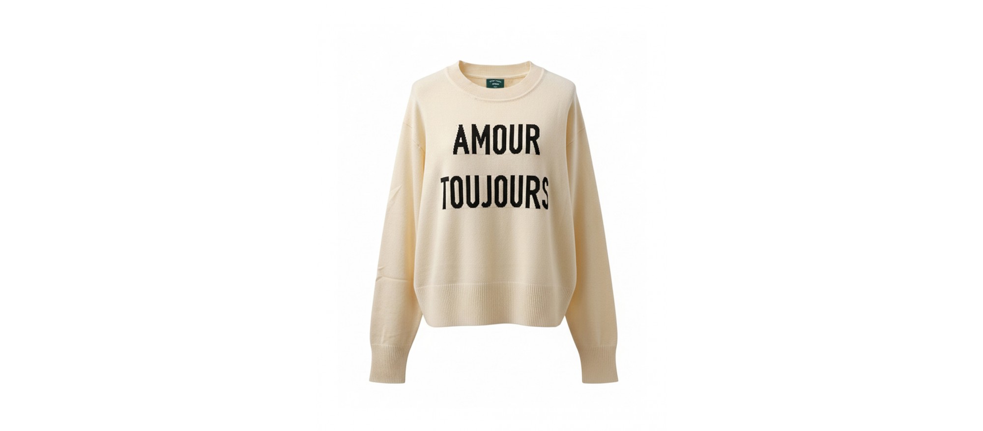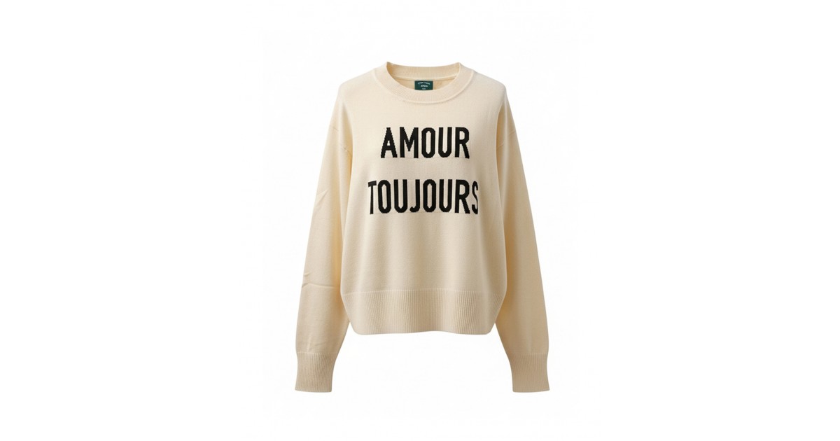 Un jersey ligero y elegante en tono beige, con el texto en jacquard “Amour Toujours” al frente. Una pieza sutil pero cargada de significado, que transmite el espíritu romántico y atemporal de la cápsula. Perfecto para combinar con cualquier look de día.