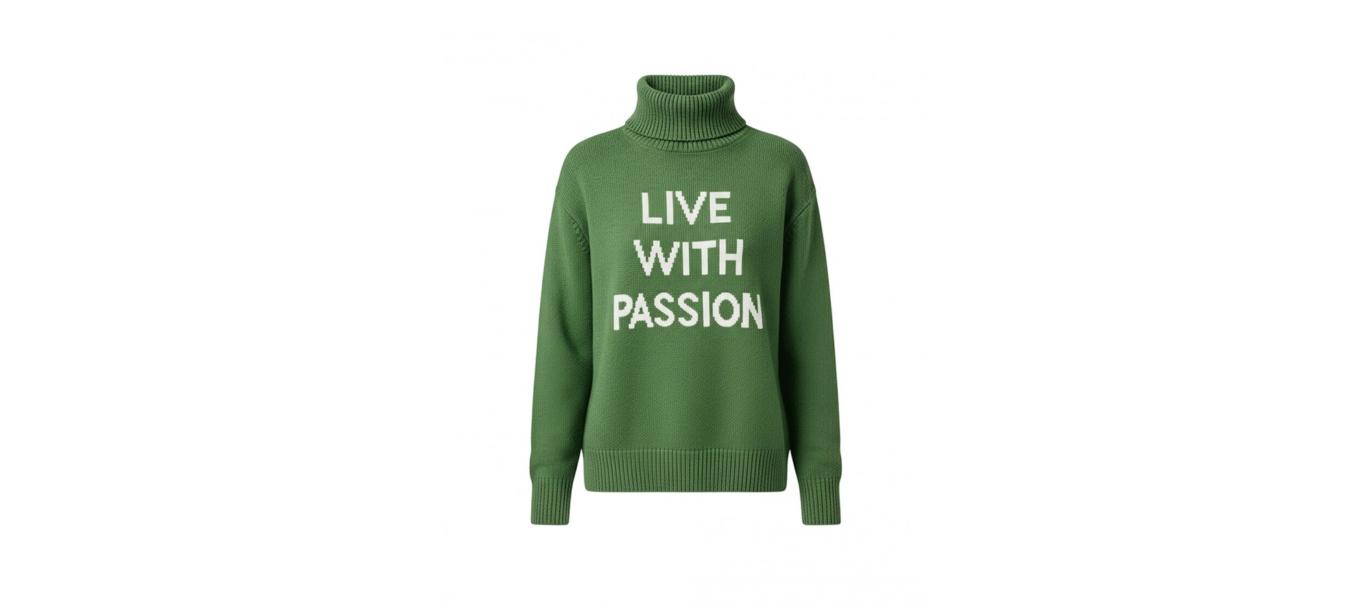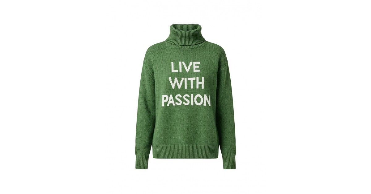 La esencia de IMILOA en una sola prenda: “Live With Passion”. Este jersey en verde profundo transmite energía y vitalidad, recordando que la moda es también una invitación a vivir con intensidad cada día.