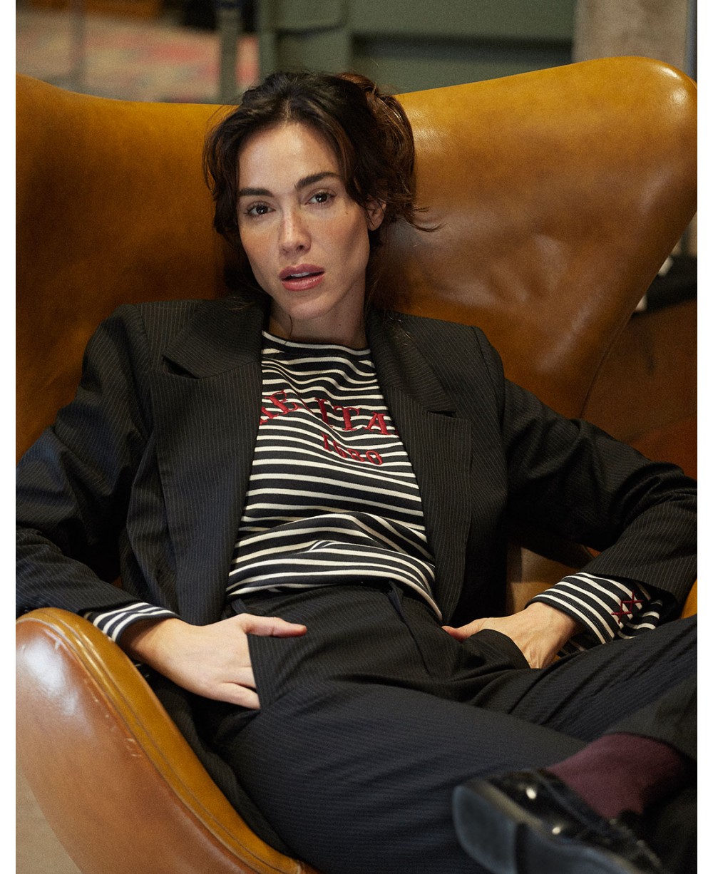 La blazer recta con raya diplomática de la colección AW24 de IMILOA es un clásico reinventado con un toque moderno y sofisticado. Diseñada para la mujer actual que busca elegancia y versatilidad en su día a día.